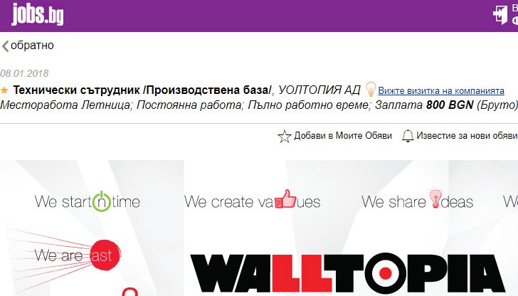 Справка в популярен сайт за обяви за работа обаче показва, че фирма WALLTOPIA търси технически сътрудник срещу брутно възнаграждение ...точно 800 лева.
