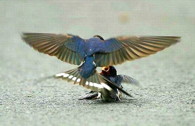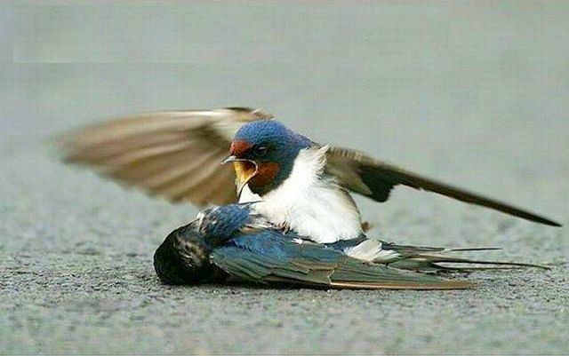 Те са едни от най - пъргавите дребни птици и за да се случи подобен инцидент, то колата наистина трябва да се движи с много висока скорост. Ранената птичка лежи на асфалта, а нейният мъжки и носи храна. Той се грижи за нея, проявявайки истинска преданост, любов и състрадание.