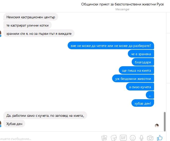 Общинските служители отсекли, че не се занимават с котки. Обвинили я, че котката е родила там, понеже някой я е хранил. След това я уведомили, че в Русе няма институции, отговорни за котките.
