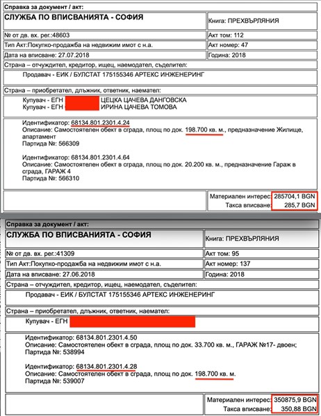 Само месец преди сделката с Цачева, абсолютно идентичен апартамент в същата сграда (с малко по-голям гараж) е продаден с 65 000 лв. по-скъпо. Продължаваме да разглеждаме многобройните партиди на "Артекс" и за други интересни имена и транзакции.