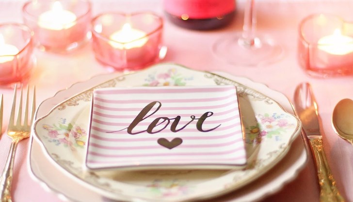 Оформете масата изцяло в червено – от покривката и салфетките, през посудата, до цвета на ястията. Психолозите са доказали, че червените чинии намаляват апетита, така че ще можете по-бързо да се преместите в спалнята. Ако нямата достатъчно червени аксесоари, купете по-голямо количество червена панделка и превържете елегантно с нея салфетките, свещите, приборите. Бутилката с вино можете да украсите, като окачите на гърлото й валентинка-изненада.