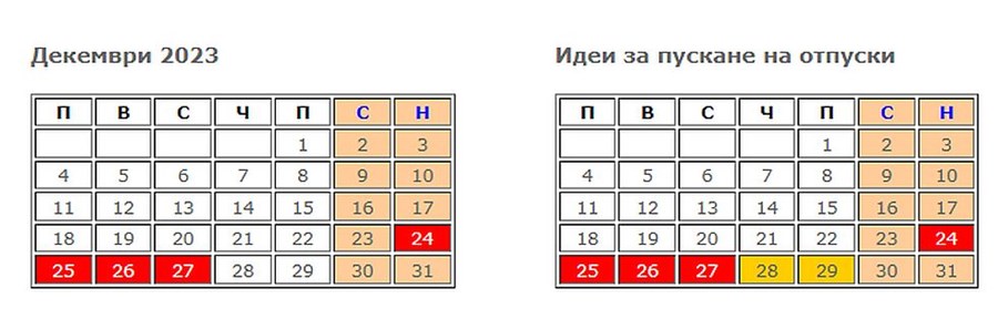 Около Коледа имате възможност да си вземете отпуска 28 и 29 декември и така вместо 5 дни, да имате 9 дни (от 23 до 31 декември вкл.) почивни.