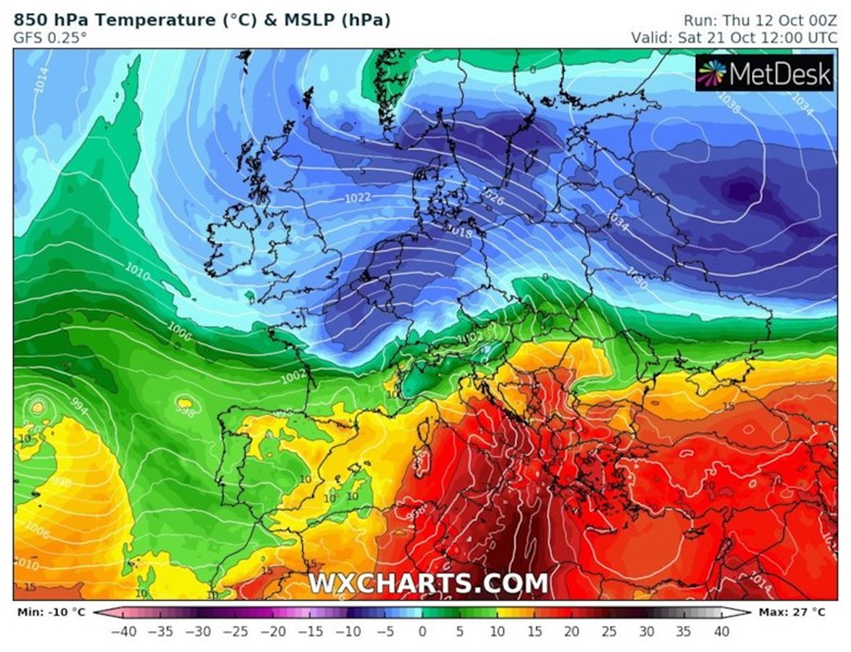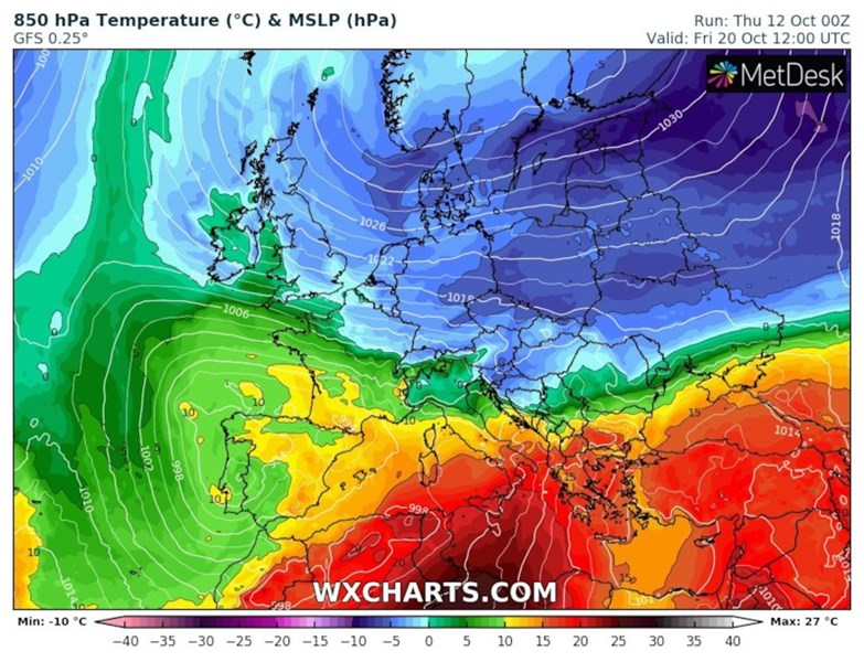 Преди около 24 часа и Европейският модел за средносрочни преноси, започна да прогнозира очаквано застудяване към края на следващата седмица. Наблюдаваме, че и двата модела, имат несигурност към предстоящата синоптична обстановка. Защото определянето на местоположението на полярния фронт е трудна задача и за давате модела. Преди предполагаемата голяма промяна се очакват необичайно високи температури за октомври, информира Meteo Balkans.