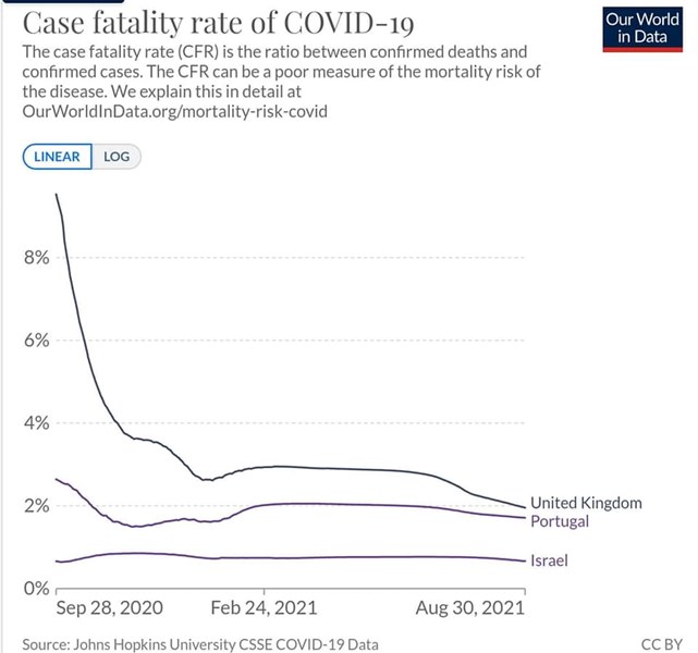 В отговор на разгорялата се дискусия за влиянието на мащабната ваксинация за намаляване на процента на случаите с фатален край, Ви представям графики на Университета Джонс Хопкинс, от които се вижда, че процентът на починали спрямо заразени е постоянен през последната 1 година и линията на CFR е хоризонтална, независимо от процента на ваксинираните и от периода, в който се очаква двете дози да са подействали