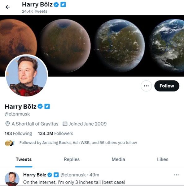 Илон Мъск, главният изпълнителен директор на компаниите "Тесла" (Tesla) и "Спей Екс" (SpaceX) смени името си в социалната мрежа "Туитър" (Twitter) на "Хари Болц", озадачавайки феновете и последователите си, информира електронното издание "ей би пи", цитирано от БТА.