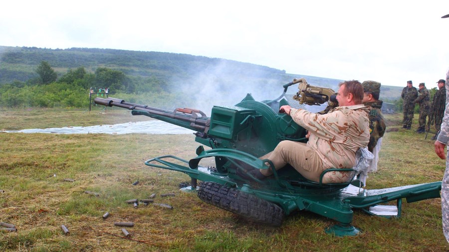 На кадри, разпространени от пресцентъра на МО, се вижда как той борави с автомат „Калашников“, лека картечница и... 23-милиметрова зенитна установка ЗУ 23-2.