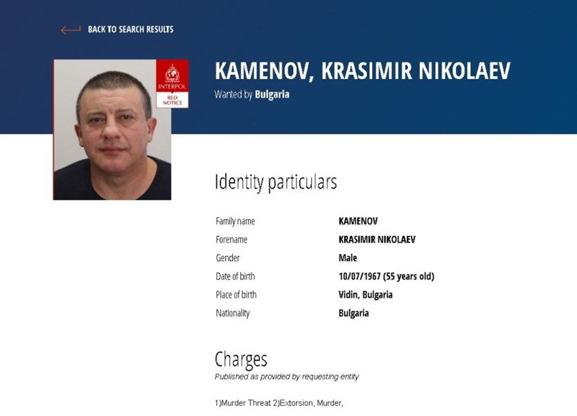 От справка на сайта на Интерпол става ясно, че Каменов се издирва за убийство, заплаха за убийство и изнудване