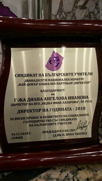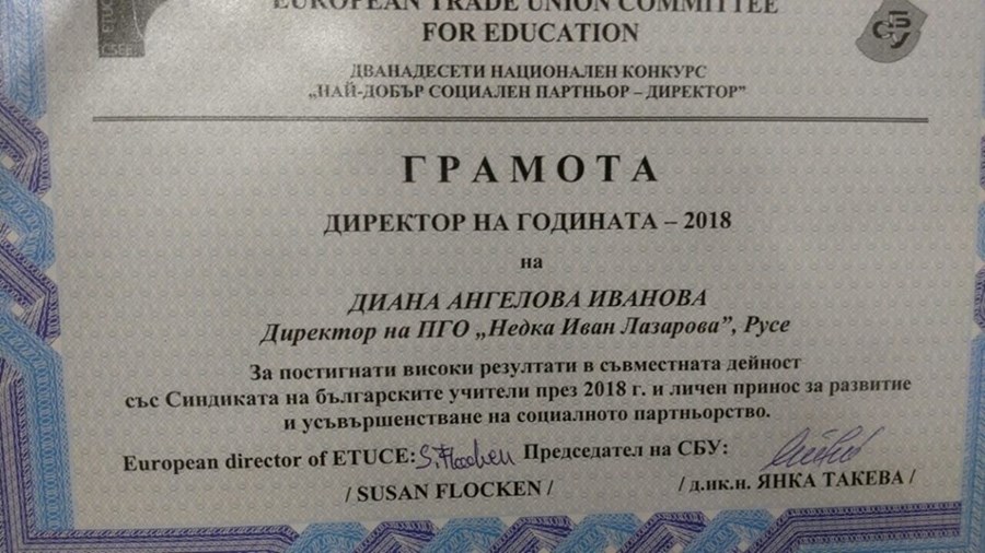 Инж. Диана Иванова – Директор на Професионална гимназия по облекло „Недка Иван Лазарова“ – Русе получи престижния приз „Директор на годината – 2018“ като най-добър социален партньор след номинация в Националния конкурс на Синдиката на българските учители.