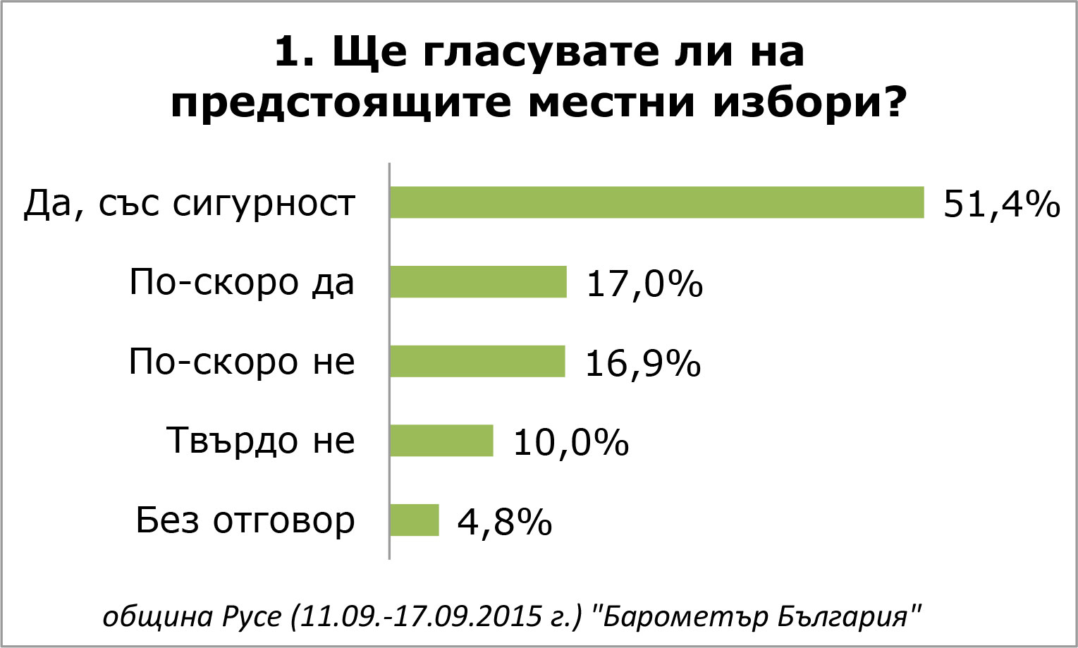 51,4% от анкетираните жители на община Русе заявяват, че със сигурност ще упражнят правото си на глас в предстоящите на 25 октомври избори за местна власт. „По-скоро да“ отговарят 17% от анкетираните, 16,9% пък казват „по-скоро не“. Твърдо няма да гласуват 10%, а 4,8% не дават отговор на въпроса.