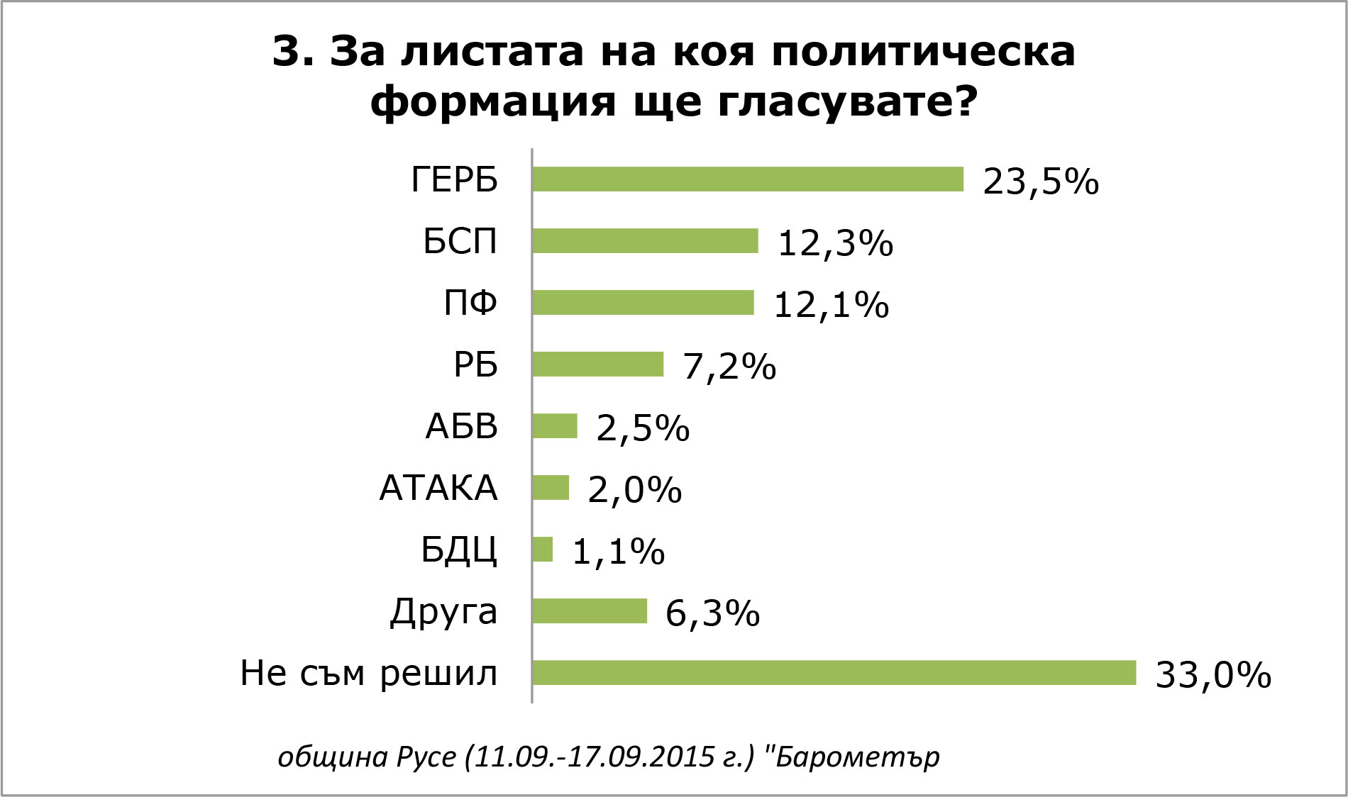 23,5% от заявилите, че ще гласуват на изборите в Русе биха подкрепили листата с общински съветници на ГЕРБ. За листата на БСП биха дали гласа си 12,3%, а за тази на ПФ – 12,1 %. Кандидатите за съветници от РБ биха получили подкрепата на 7,2%, на АБВ – 2,5%, Атака – 2%, БДЦ – 1,1%. 33% не са решили листата на коя политическа формация да подкрепят, а 6,3% отговорят „друга“.