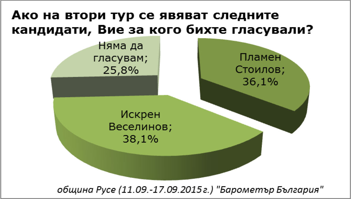 При положение, че на балотаж се явят Пламен Стоилов и Искрен Веселинов, то тук победата би била за кандидата на ПФ. Искрен Веселинов би поучил подкрепата на 38% от заявилите, че ще гласуват, а Пламен Стоилов – на 36,1%. Заявка, че няма да гласуват при такъв сценарий за втори тур дават 25,9%.