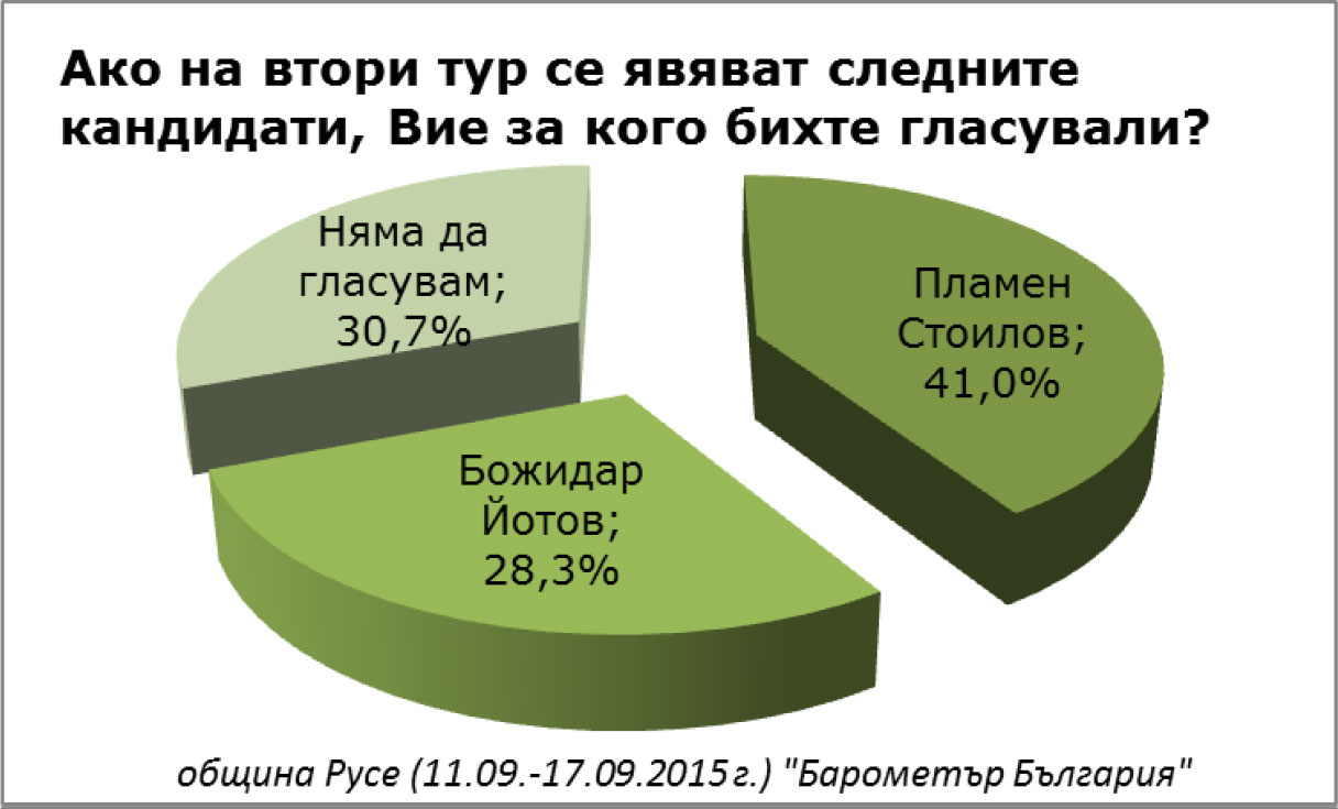 Ако до втори тур достигнат кандидатите Пламен Стоилов и Божидар Йотов, то Стоилов би спечелил с 41% от гласовете срещу 28,3% за Йотов. При такъв вариант 30,7% заявят, че няма да гласуват на балотажа.