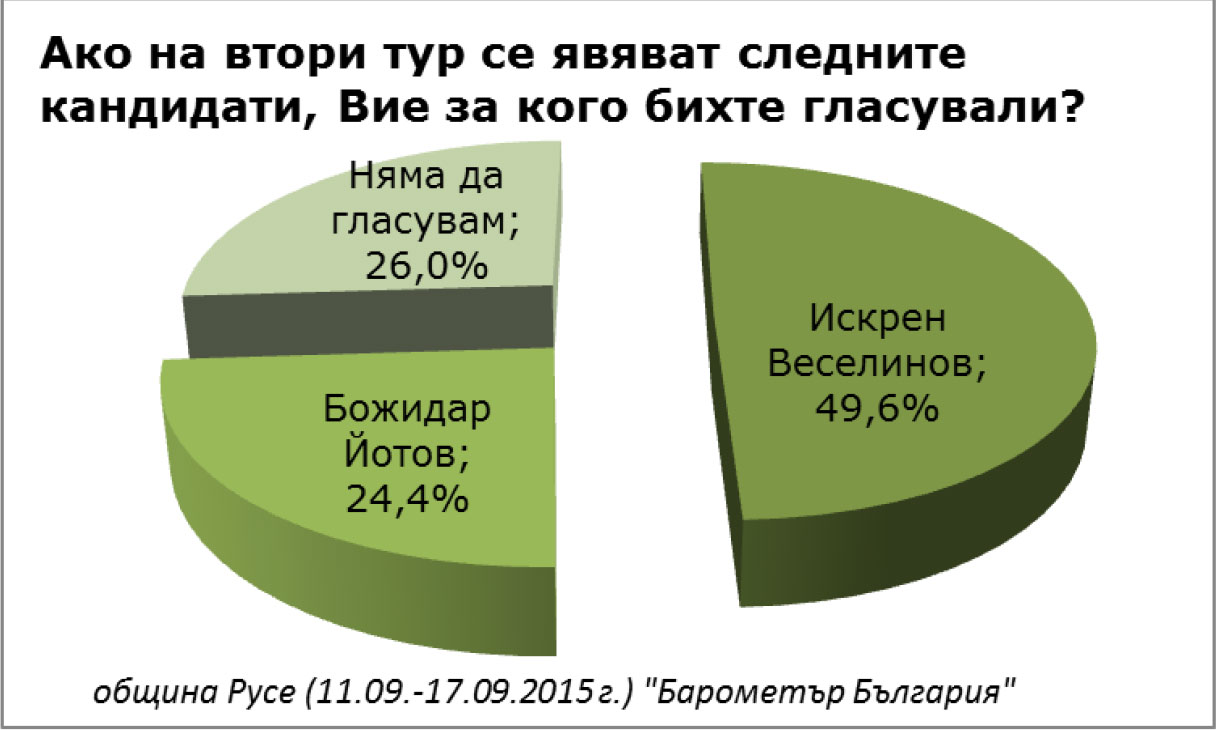 Ако настоящият градоначалник не достигне до втория тур на изборите, а на балотаж се явят кандидатът на БСП Божидар Йотов и на ПФ Искрен Веселинов, то следващият кмет би бил Веселинов с резултат 49,6% срещу 24,4% за Йотов, а 26% не биха гласували при такъв вариант.
