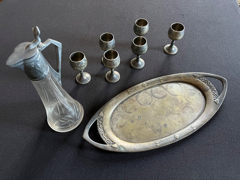 Сервизът е серийно машинно изделие, вероятно изработено от алпака през 30-те г. на ХХ век в стил Ар деко. Каната е от кристално стъкло с рязана украса. Подобни изделия се продават в русенските магазини и през 40-те и са част от буржазното всекидневие, а с тях дамите са пиели домашно приготвена вишновка.