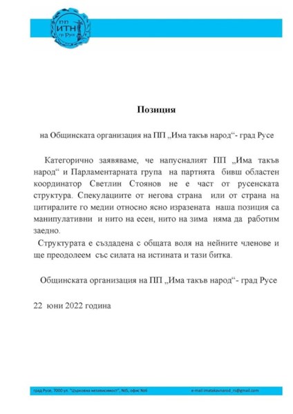 Категорично заявяваме, че напусналият ПП „Има такъв народ“ и Парламентарната група на партията бивш областен координатор Светлин Стоянов не е част от русенската структура. Спекулациите от негова страна или от страна на цитиралите го медии относно ясно изразената наша позиция са манипулативни и нито на есен, нито на зима няма да работим заедно.