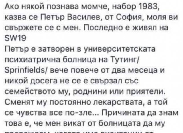 „Ако някой познава момче, набор 1983, казва се Петър Василев, от София, моля ви свържете се с мен” – пише Диана Котева в група за българи, живеещи във Великобритания във "Фейсбук".