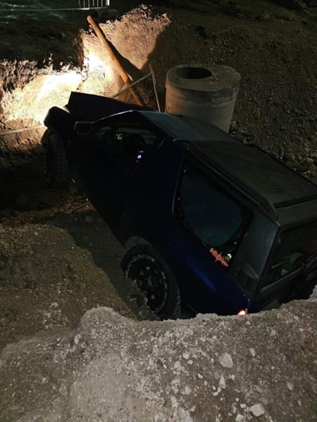 Това става ясно от пост в социалната мрежа на жител от квартала. Джипът буквално се е заклещил между стените на изкопа, който е направен по повод ремонтните дейности на водопроводната мрежа. Не е ясно дали инцидентът е станал в тъмната част на денонощието и шофьорът не е видял откъде минава.