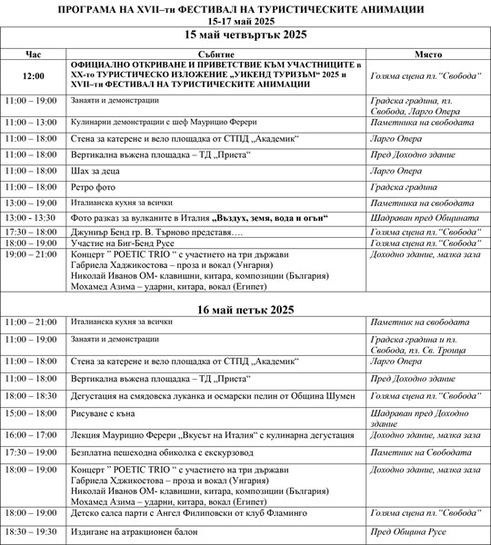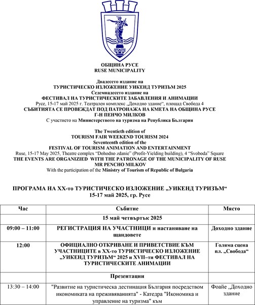 Юбилейното 20-то издание на „Уикенд туризъм" и 17-ият Фестивал на туристическите забавления и анимации се организират от Община Русе и ОП „Русе Арт" в партньорство с Министерството на туризма и с подкрепата на Италианския културен институт. Тази година акцентът е поставен върху италианската култура, кухня и изкуство.