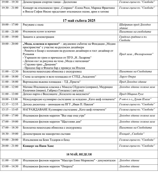 Кулминацията на вечерта ще бъде концертът на италианското трио „Сопрано" – Елена Роси, Марика Франчино и Виола София Нисио, които ще представят италиански арии, филмова музика и съвременни хитове в кросжанров аранжимент. Концертът започва в 19:30 часа на площад „Свобода".
