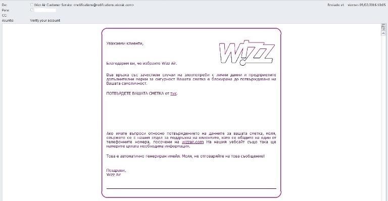 Голяма част от регистрираните български потребители в сайта на превозвача, които поне веднъж са купували самолетен билет от там, са получили имейл с подател Wizz Air Customer Service, графично наподобяващ писмата, които компанията праща, но с тема: Verify your account