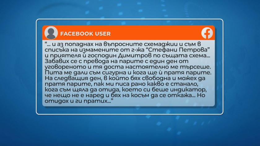 "Тя ми върна след известно време съобщение, че е получила сумата и се разбрахме, че ден преди тръгването ще се чуем и до ден днешен не сме се чули", каза потърпевшата.