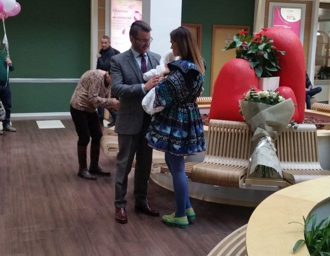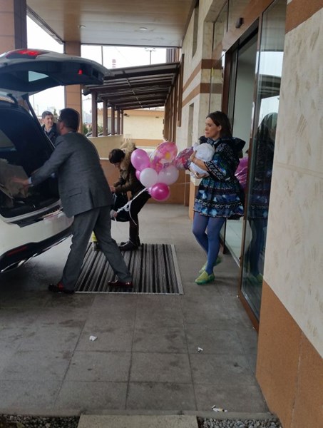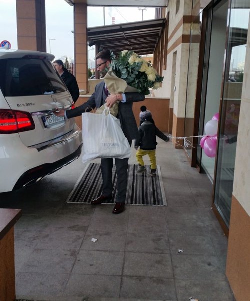Енчеви баща и син пристигнаха в болницата близо час преди изписването. Старши се появи изтупан в официален костюм и с огромен букет бели рози в ръка, докато наследникът му Филип кръжеше около него с букет от розови балони, каквито прилягат на момиче.