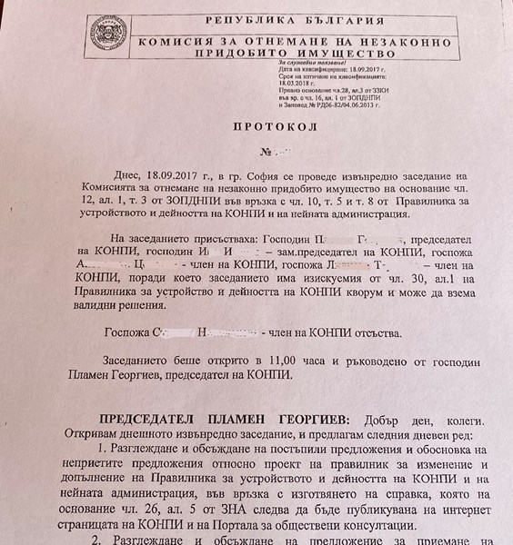 Специализирана прокуратура публикува част от иззетата документация, свързана с искане на главния прокурор до Народното събрание и протоколи от решения на КПКОНПИ, открити при претърсването на кабинета на секретаря на президента Пламен Узунов.