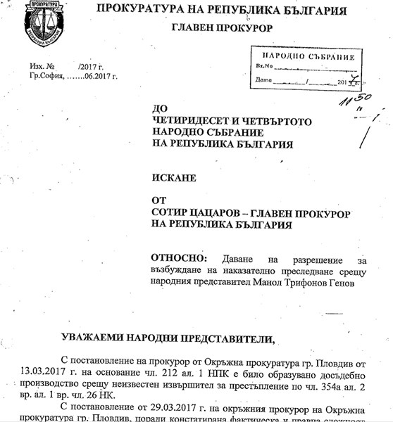 В същия кабинет е намерено и иззето копие на цялата преписка по искане на главния прокурор на Република България до Народното събрание от 2017 г. за даване на разрешение за възбуждане на наказателно преследване срещу народния представител Манол Тр. Генов за извършени от него престъпления по чл. 277 а, ал. 4, във връзка с чл. 20, ал. 3, във връзка с ал. 1 и по чл. 167, ал. 3, във връзка с чл. 26, ал. 2, във връзка с ал. 1 от НК. Сред иззетата документация са и копия от разпити пред съдия на свидетели, вкл. такива с тайна самоличност. Предстои прокуратурата да установи по какъв начин обвиняемият П.У. е получил копие от преписката, адресирана единствено до Народното събрание, при положение, че като секретар на президента по правни въпроси и антикорупция, не е разполагал с подобни правомощия.