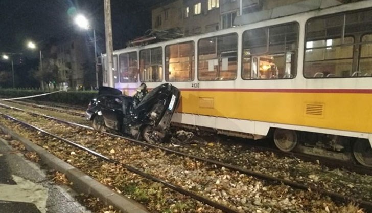 Първи кадри се появиха от тежката катастрофа между трамвай 20 и лек автомобил, която стана късно снощи в София.