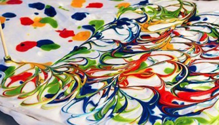 Нужни материали: яйца, оцет, хранителни боички, евтина пяна за бръснене, клечка за зъби, голям плосък съд и прозрачно фолио за готвене.