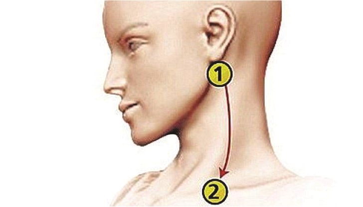 Линията, която е показана на изображението, не трябва нито да се притиска, нито да се масажира. Това, което трябва да направите, е да я докоснете леко от горе надолу, използвайки само върха на пръстите си. Повторете процеса 10 пъти от едната страна на шията и 10 пъти от другата страна на шията. Точка номер 2 е разположена близо до ключицата и трябва да бъде масажирана в продължение на 1 минута от двете страни. Трябва да се притисне, но не прекалено, а само леко.