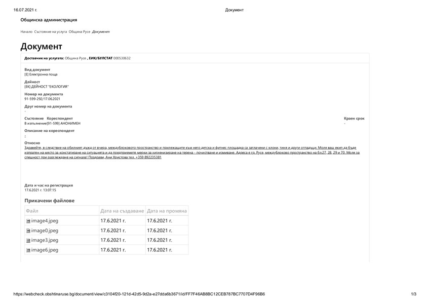 Вслушах се в препоръката на кмета Пенчо Милков към гражданите на Русе, да подават сигнали на официалната страница на общината. Сигнала, придружен със снимков материал, изпратих още на следващият ден - 17 юни с очакване, ако не в рамките на ден-два, то поне да има реакция до седмица. Давам си сметка, че в такива ситуации първо следва да се отводнят и почистят основните артерии в града.
