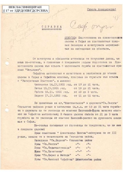 Три секретни документа на 03 отдел на Трето секретно политическо управление на ДС от 1955 г. хвърлят светлина върху контрола върху посещенията на църквите по време на един от най-големите християнски празници Възкресение Христово.