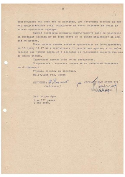 Срещите с агентите по линия на духовенството по време на църковните празници са осъществявани всекидневно. Водена е статистика за посещенията на църковните храмове от гражданите. Направено е заключението, че причината за посещението на църквите от млади хора е любопитството.