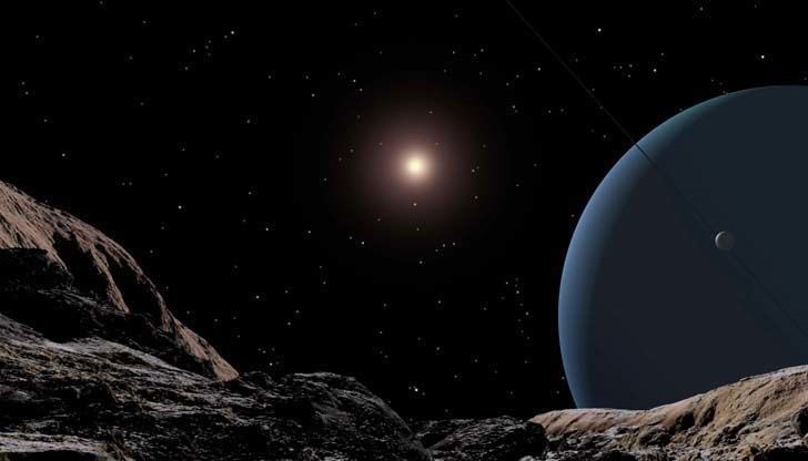 Нептун (поглед от спътника му Тритон), който е 4,5 милиарда километра от Слънцето. На хоризонтаѝ се виждат криовулкани.