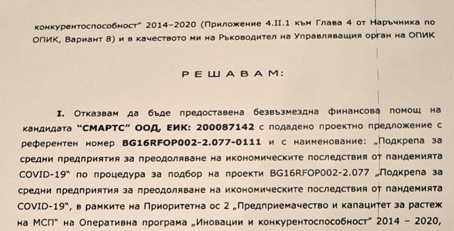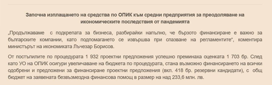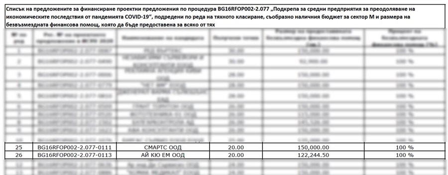 На първата ще видите списък на едни одобрени компании по европейска оперативна програма за подпомагане на средните предприятия за преодоляване последствията от Covid-19. Там виждате две компании, в които аз имам честта да имам собственост и да управлявам ежедневно. В тези компании работят общо над 60 човека, не съкратихме нито един откакто е почнал този ад. Бяхме одобрени да получим финансиране, което щеше да ни помогне да продължим уверено напред.
