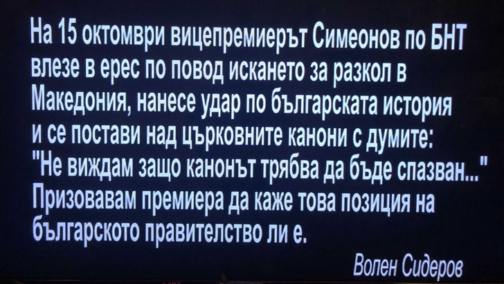 "На 15 октомври вицепремиерът Симеонов влезе в ерес по повод на искането за разкол в Македония, нанесе удар на българската история и се постави над църковните канони с думите: Не виждам защо канонът трябва да бъде спазен... Призовавам премиера да каже това позиция на българското правителство ли е.", пише на телевизионния екран.