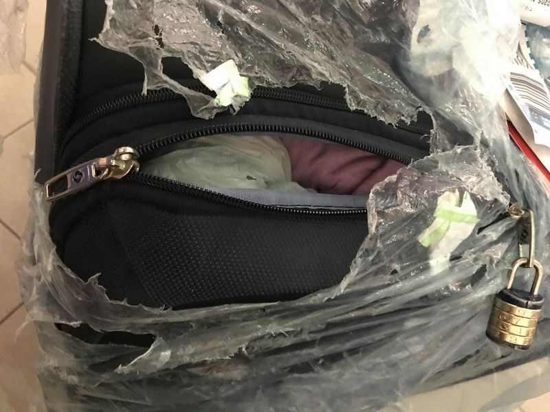 Куфарите ми пристигнаха. Но големият – най-големият размер Самсонайт, дойде отворен, както се вижда на снимката. Само пликът, в който го сложиха японците и който турците на летището в Истанбул не са могли да разкъсат докрай, го е спасил от по-големи поражения и открадване на повече вещи.