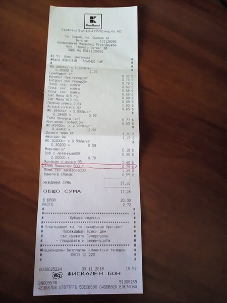 Преглеждайки си касовата бележка от Кауфланд, забелязах, че имам платен хляб, който не съм купувала.