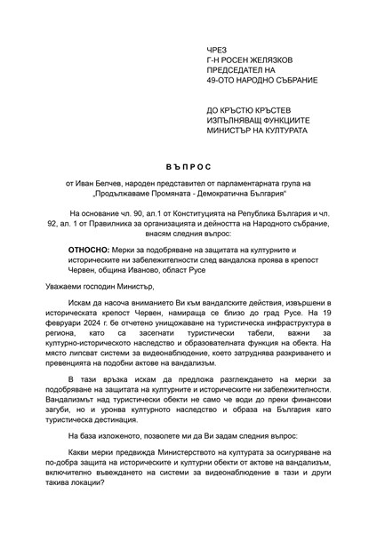 Този въпрос зададе депутата от ПП-ДБ Иван Белчев. Поводът за него е вандализмът в крепостта Червен: