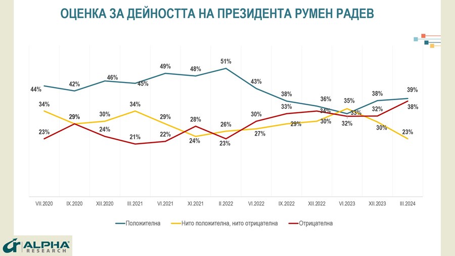 Президентът Румен Радев запазва равнището си на доверие от края на 2023 г.– 39% одобрение срещу 38% неодобрение и 23% неутрално отношение, според изследването.