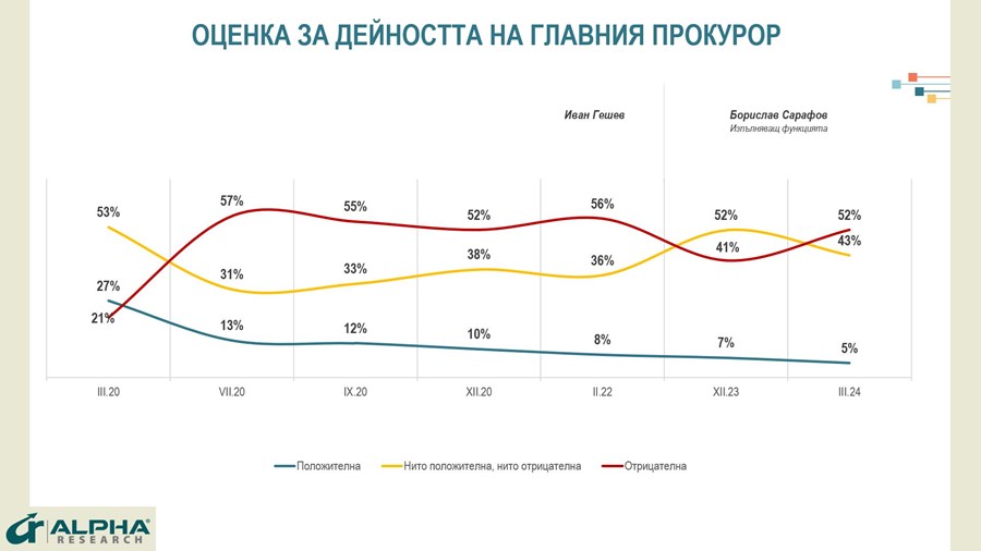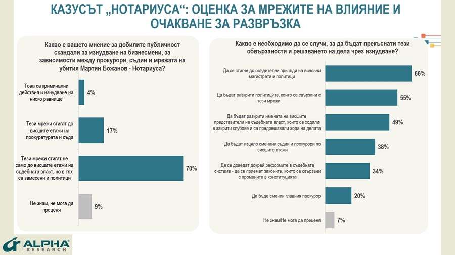 Оценките за работата на изпълняващия функциите главен прокурор Борислав Сарафов остават на нивото на неговите предшественици – 5% положителни, 52% отрицателни и 43% неутрални. Едва 4% от анкетираните смятат, че разкритията за мрежи от зависимости в съдебната система засягат криминални действия и изнудване на ниско ниво. Общо 17% са на мнение, че зависимостите достигат и спират до висшите етажи на прокуратурата и съда. Мнозинството, 70%, са на мнение, че в тези мрежи са замесени и политици.