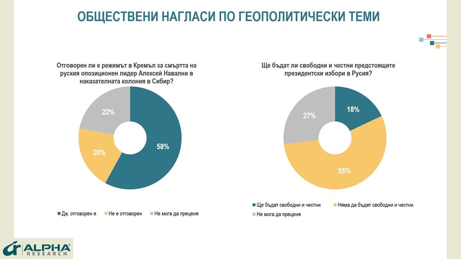 Проучването на „Алфа рисърч“ разглежда и обществените нагласи по геополитически теми. Според данните доминира мнението, че за смъртта на руския опозиционен лидер Алексей Навални е отговорен режимът в Кремъл. За 58% от участвалите в допитването действията на управляващите в Русия са довели до физическото премахване на критика на Путин. На противоположното мнение са 20%, а други 22% се затрудняват да преценят. Близо 2/3 от участниците споделят, че са обсъждали войната в Украйна с близките си през последните няколко седмици.