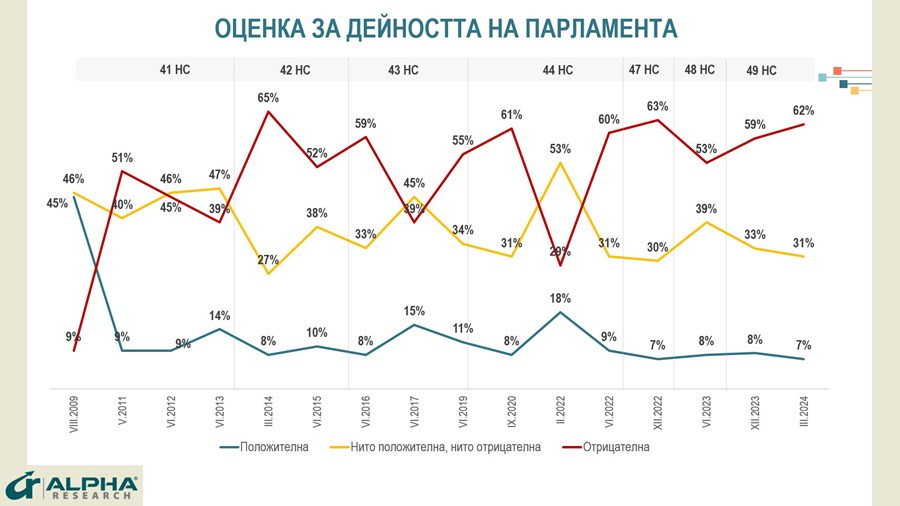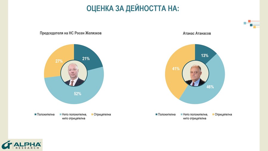 Отношението към парламента в изследването е 7% одобрение и 62% неодобрение. Отношението към настоящия му председател Росен Желязков е по-позитивно в сравнение с това към институцията – 21% положителни, 52% неутрални и 27% отрицателни оценки. По-сдържани са очакванията към Атанас Атанасов като вероятен следващ председател на Народното събрание – 13% положителни, 46% неутрални и 41% отрицателни, посочват от агенцията.