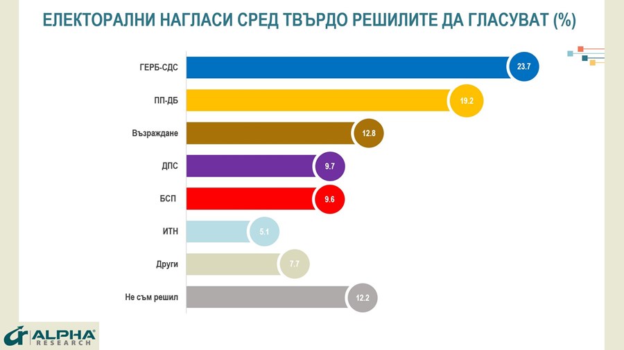 Лидер в предпочитанията на твърдо решените да гласуват в национални избори е ГЕРБ с 23,7% и преднина от 4,5 пункта пред настоящите си партньори „Продължаваме промяната – Демократична България“ (ПП-ДБ) (19,2%), показва проучването. Бойко Борисов е най-одобряваният партиен лидер с 21,6% доверие, но и съществен дял недоверие – 51%. От съпредседателите на „Продължаваме промяната“ Асен Василев има 13,8% доверие срещу 61,1% недоверие, а Кирил Петков – 13,1% доверие срещу 64,3% недоверие. Съпредседателят на ДБ Христо Иванов е с 15,2% доверие срещу 49,7% недоверие. Третата позиция в потенциален парламентарен вот според проучването е за „Възраждане“ (12,8%). Персоналното доверие в Костадин Костадинов към момента е 15% одобрение срещу 57,2% неодобрение.
