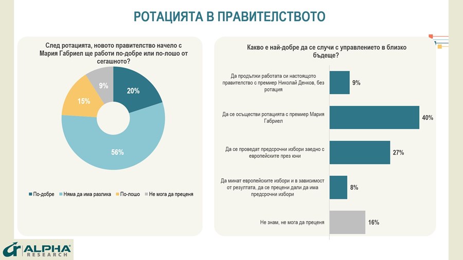 Най-голяма част от анкетираните - 40%, смятат, че правилното решение за страната е ротацията в изпълнителната власт да се състои. Други 27%, основно избиратели на БСП, „Възраждане“ и ДПС, виждат по-добър изход в избори „2 в 1" заедно с европейските. Това показва проучване на агенцията „Алфа рисърч“, осъществено в периода 27 февруари – 3 март 2024 г., публикувано на сайта на агенцията.