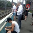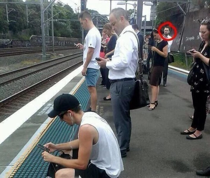 Погледни всички хора, които са заснети. Те всички до един са се вкопчили във своите телефони и са навели главите си. А мъжът, ограден в червен кръг се откроява от тълпата. От къде идва той?! Та това е толкова необичайно!