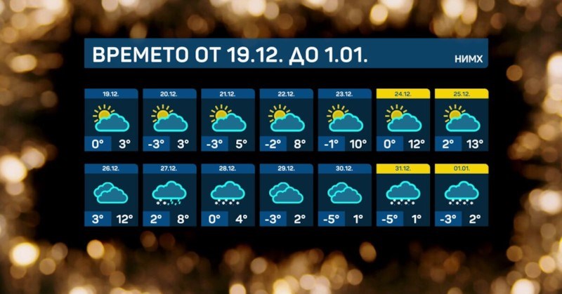 На 29 и 30 декември ще е студено – от -5° до 2° и предимно облачно време. Заради преминаването на атмосферно смущение на 31 декември и 1 януари се повишава вероятността за валежи от сняг.