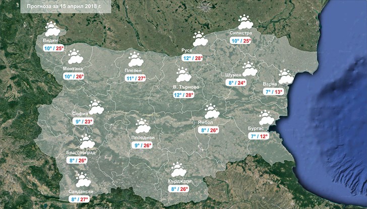 Утре ще преобладава слънчево време с висока облачност, след обяд – значителна. Ще духа слаб до умерен вятър от изток-югоизток. Минималните температури ще са от 7° до 12°, а максималните - между 23° и 28°.