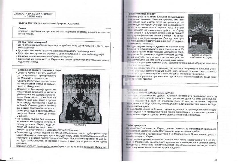 Свети Климент - първият епископ, проповядвал на български език и основател на Охридската книжовна школа - в учебниците в Скопие е представен като говорещ на "старославянски" и основоположник на "македонската църква".